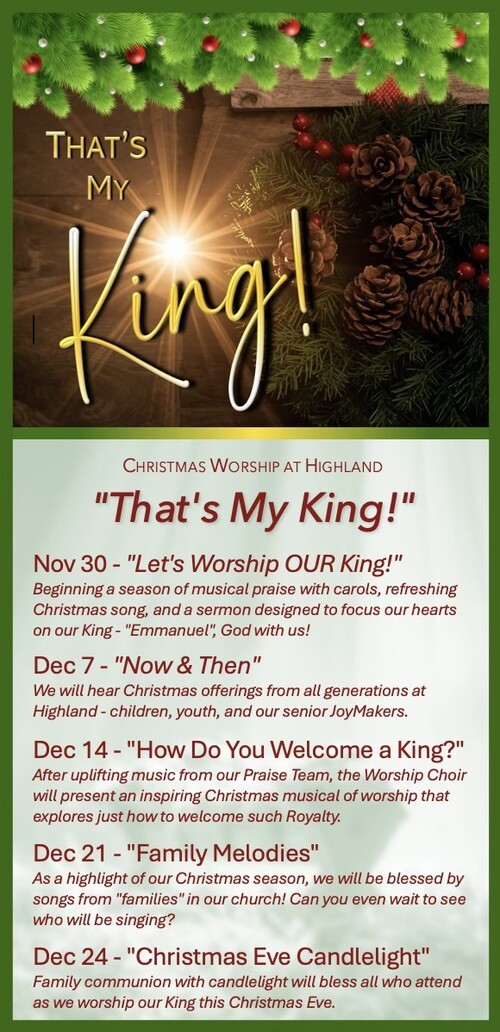 The Christmas season is one of our favorite times of the year at Highland Baptist Church, and we can’t wait to celebrate it with you! Beginning Sunday morning, November 30, join us each week for special Christmas music designed to lift your spirit and remind you of the joy and hope found in Christ. Our choir, musicians, and worship team have something beautiful planned every Sunday—perfect for the whole family.